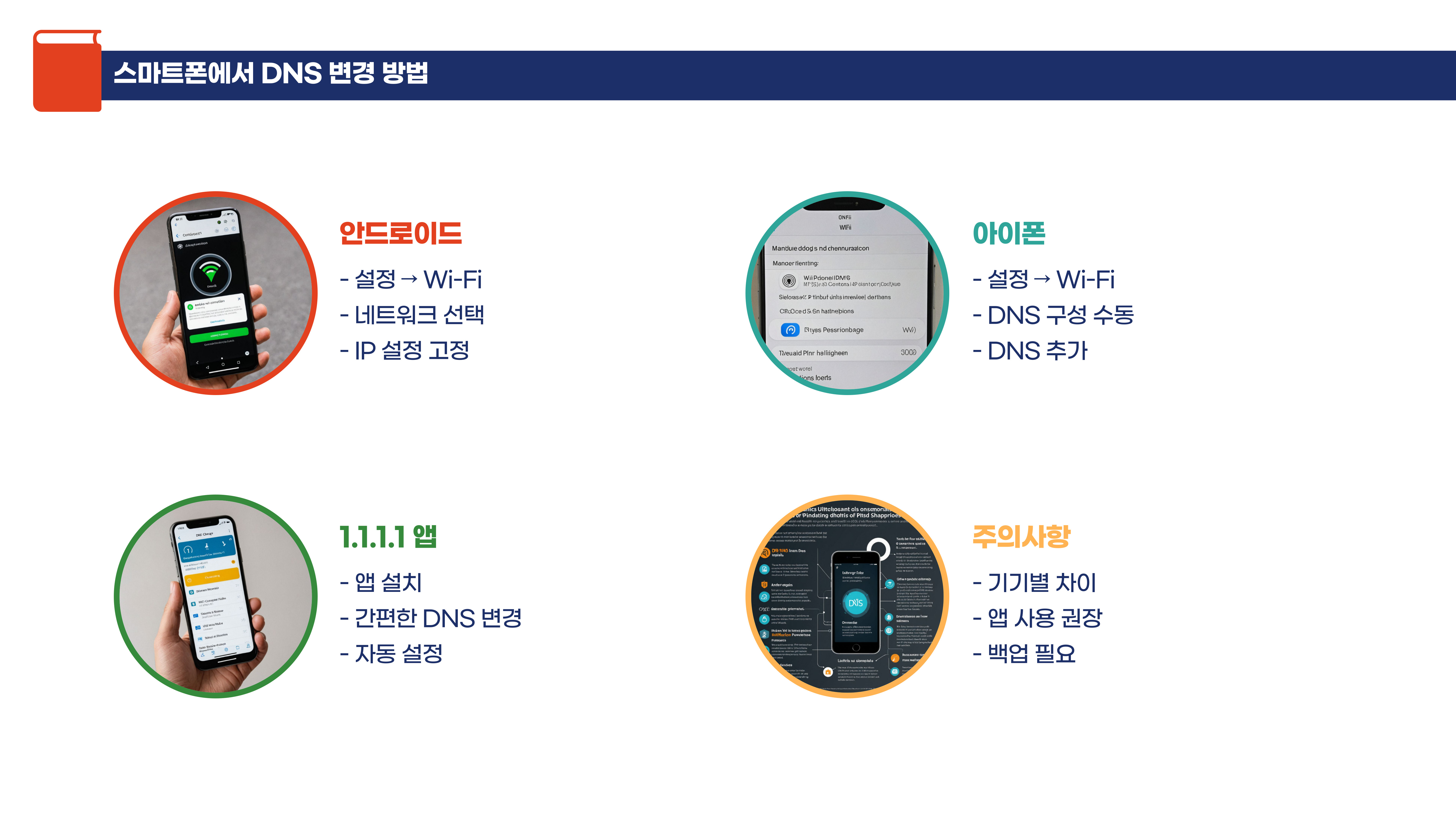 💡 일부 스마트폰에서는 직접 변경이 불가능하므로, "1.1.1.1" 앱 (Cloudflare DNS) 을 설치하면 간편하게 변경 가능