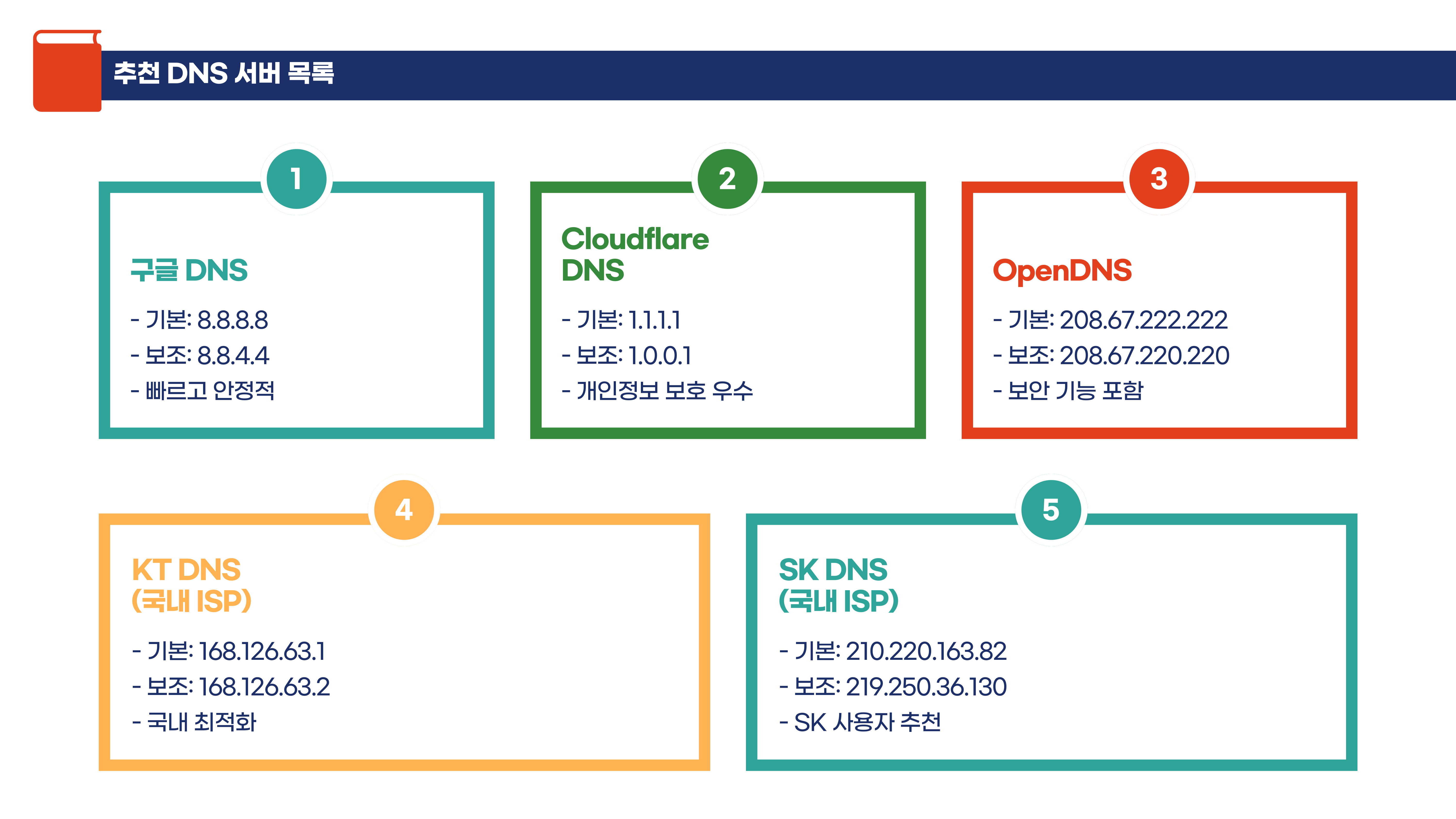 | 구글 DNS | 8.8.8.8 | 8.8.4.4 | 빠르고 안정적, 전 세계에서 사용 가능 |