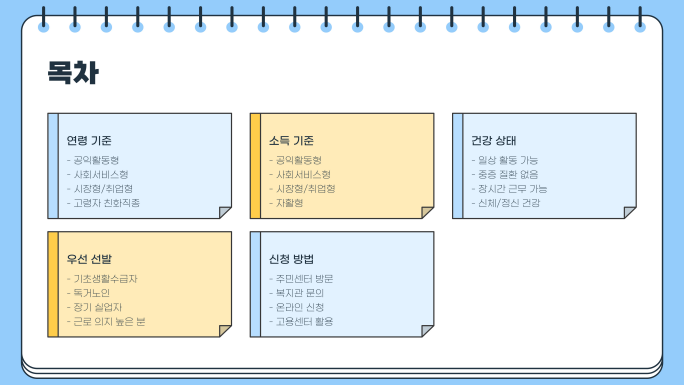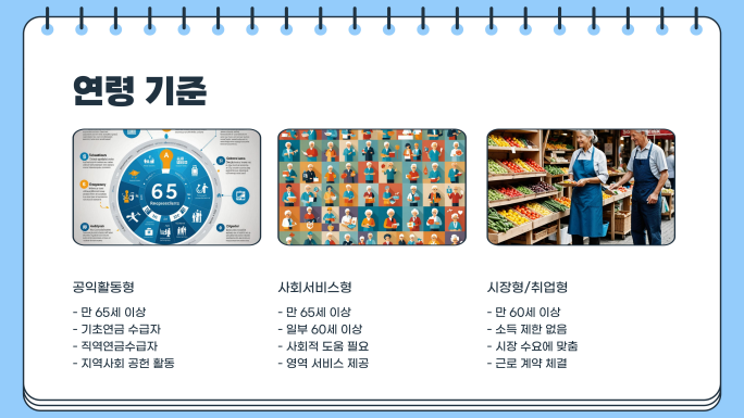 - 공익활동형: 만 65세 이상 기초연금 수급자