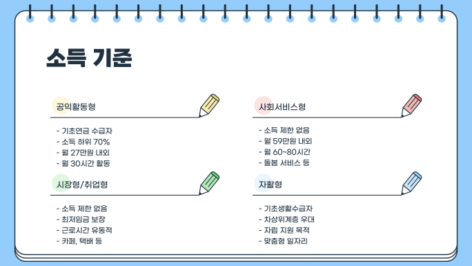 - 공익활동형: 기초연금 수급자(소득 하위 70% 이내)