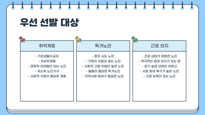 다음 조건에 해당하는 어르신들은 노인일자리 사업에서 우선 선발될 가능성이 높습니다.