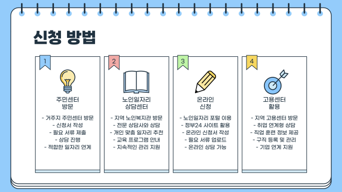 - 온라인 신청: 노인일자리 포털 및 정부 지원 사이트 활용