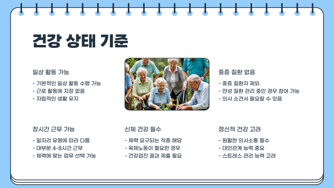 노인일자리 사업에 참여하려면 기본적인 건강 상태를 유지해야 합니다.