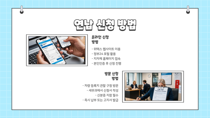 자동차세 연납 신청은 온라인과 방문 신청이 가능합니다.