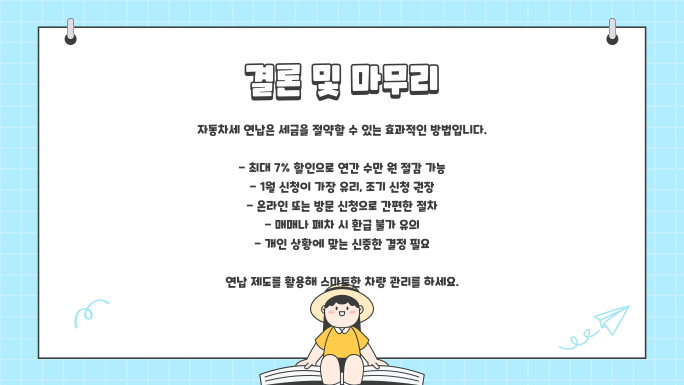자동차세 연납은 조금이라도 절세할 수 있는 좋은 제도입니다. 특히 1월에 신청하면 가장 높은 할인율(7%)을 받을 수 있으므로 적극 활용하세요! 😊